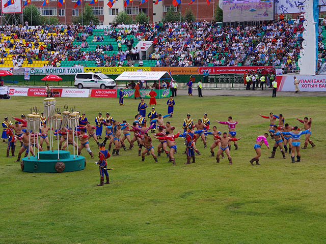 ナーダムとは「3つのゲーム」を意味し、モンゴルの伝統的な男性向けゲームであるレスリング、子供騎手による競馬、アーチェリー競技などで構成されています。